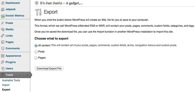 Now that your Flickr photos and video are backed up, let’s tackle your WordPress.com blog. Unfortunately I haven’t come across a totally automated and free way to backup your blog. But if you don’t mind two extra clicks a week, you can easily backup your WordPress.com blog by clicking to Tools in your dashboard and selecting Export. Make sure you select “All Content” and hit Download Export File.